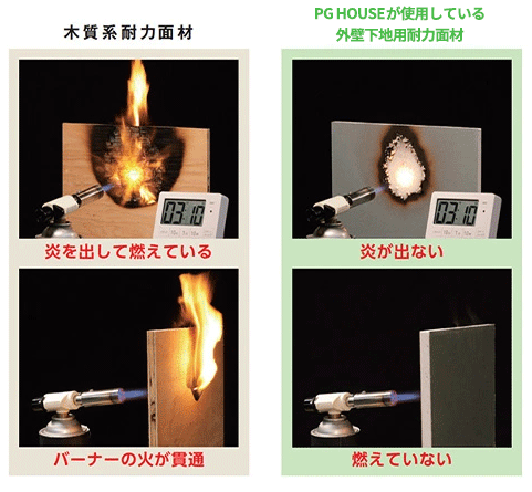 PG HOUSEが使用している外壁下地用耐力面材は木質系耐力面材と比べ、火に強く、燃えない建材です。万が一の近隣の火災発生時には、炎から、内側の柱やはりを守ってくれるので燃え広がりを防ぎ安全に避難できる時間を確保することができます。また、風などによる近隣からの貰い火でも、燃え移る可能性が低くなります。