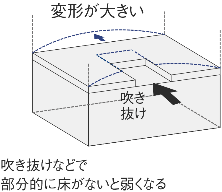 「根太レス工法」ともいい、水平力に抵抗させるために構造用合板を床下地に用いた床組みです。よって水平に加わる力やねじれに対して強くなります。
