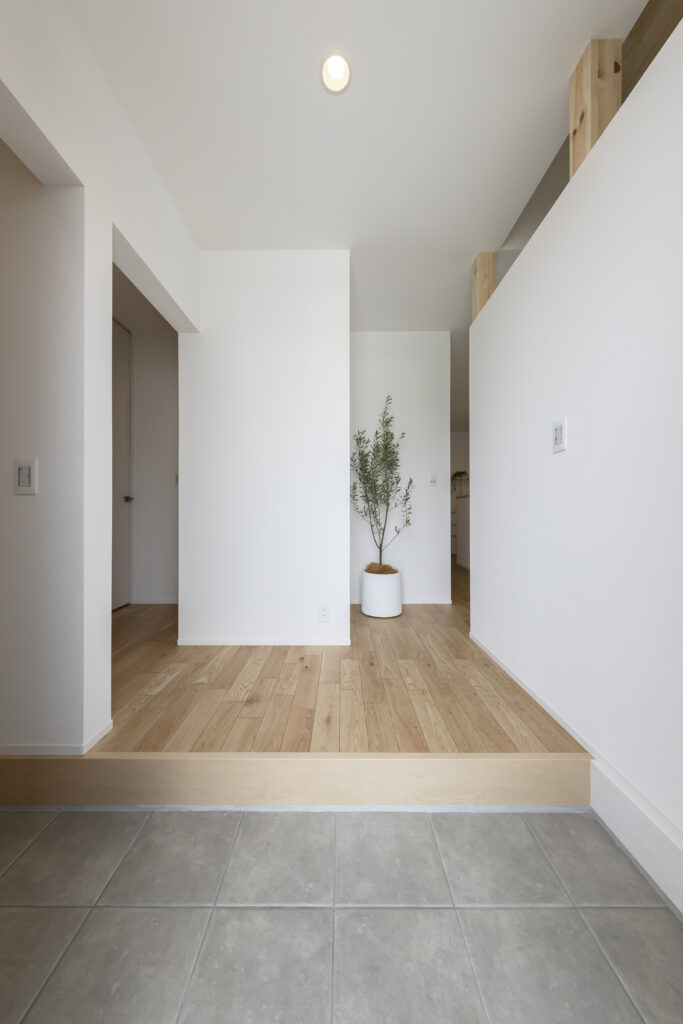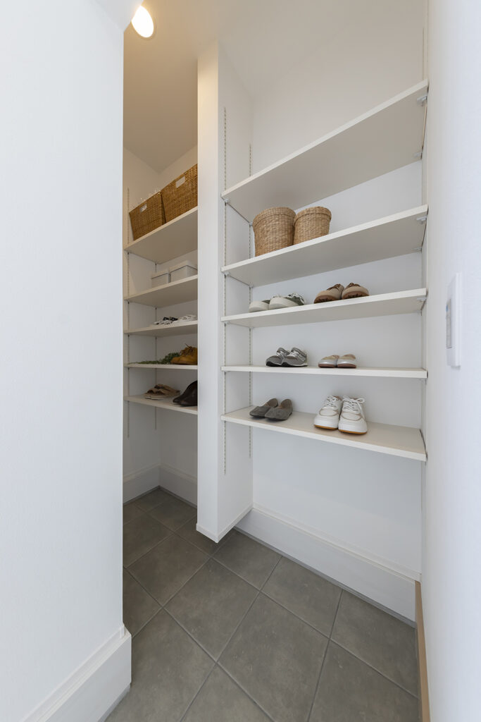 洗練されたタイル敷きが住まいの第一印象を演出します。土間続きのシューズクロークは、靴や小物以外に、ベビーカーやアウトドア用品を置いても邪魔にならない広さがあり、使い勝手抜群。