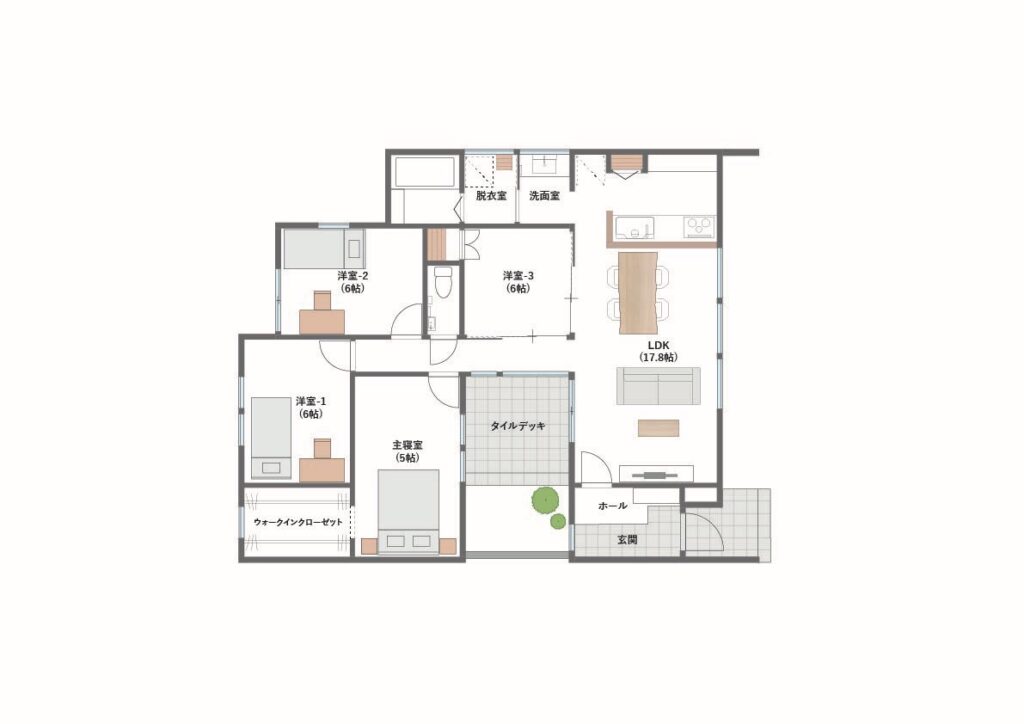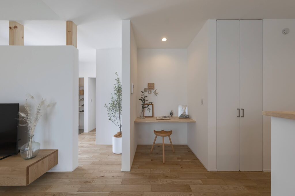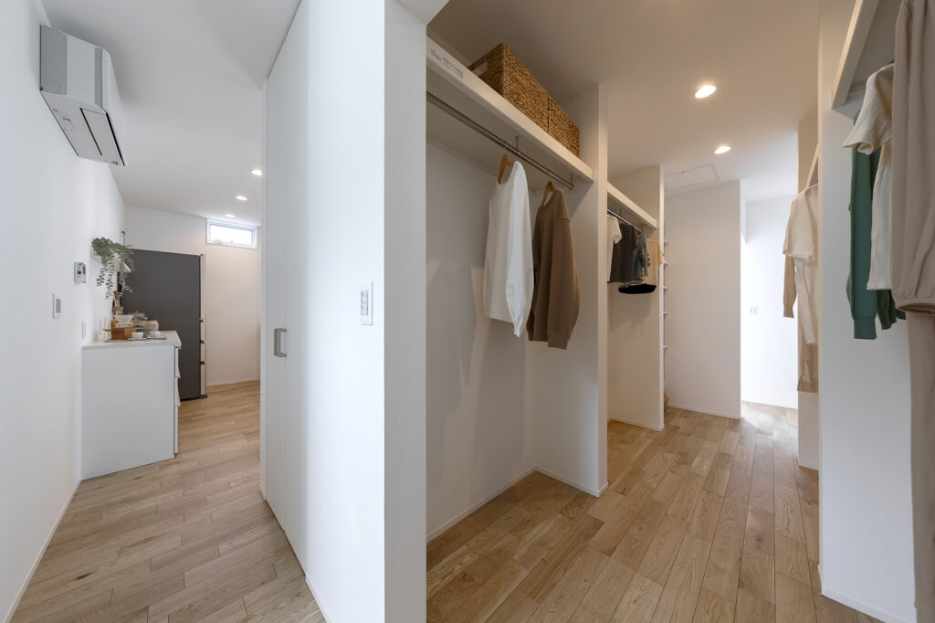 平屋で難しい「プライベート空間」と「パブリック空間」の仕切りを、家の中央にFWICを設けることで実現。玄関・ランドリー・各部屋からアクセスできるため、衣類や荷物の出し入れもスムーズにできます。