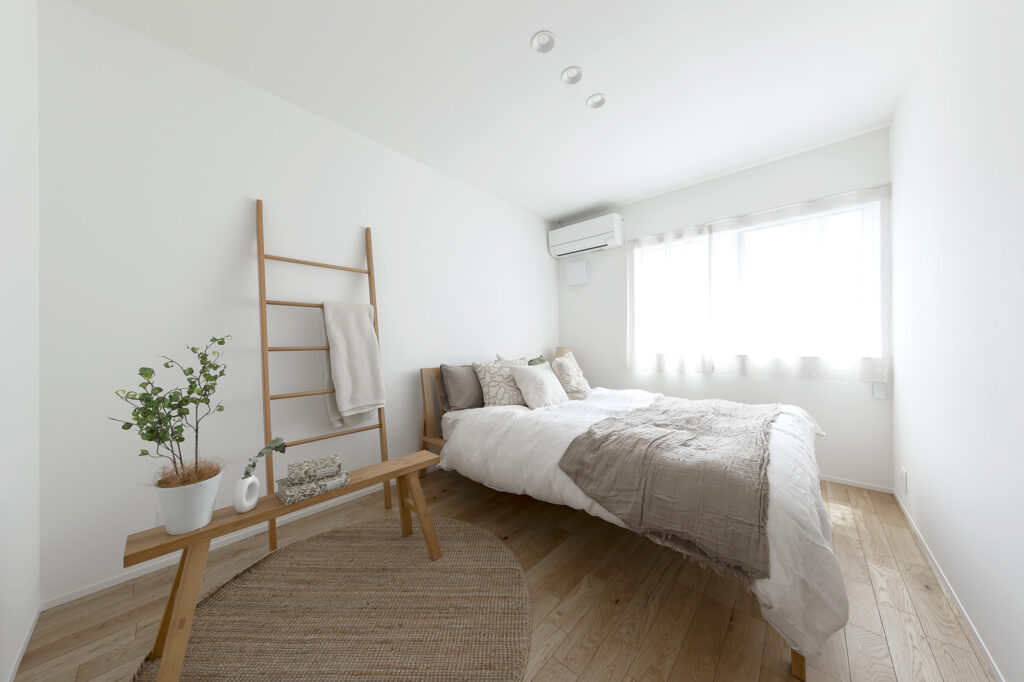 朝日の入る窓があり、爽やかな光で心地よい目覚めを迎えられる空間。ベッドの両端には、就寝前の読書やちょっとした小物の収納にも便利なサイドテーブルを置けるちょうどいい広さ。