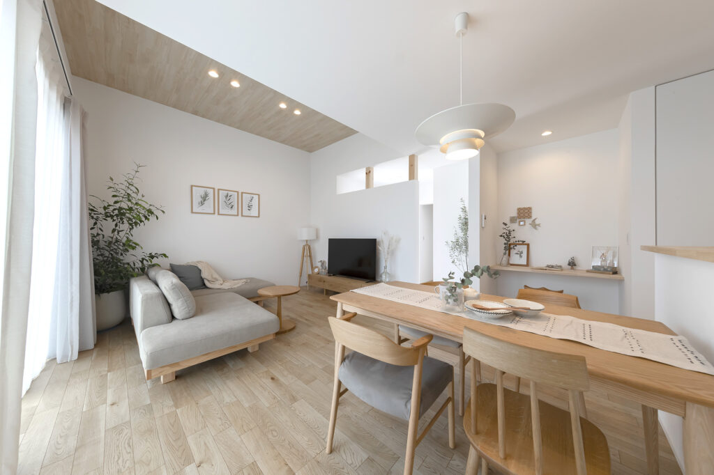 高天井で開放感のある18帖のLDK。明るい印象のナラ材の床がさらに空間を明るく、自然な木の温もりがリビング全体を優しく包み込みます。